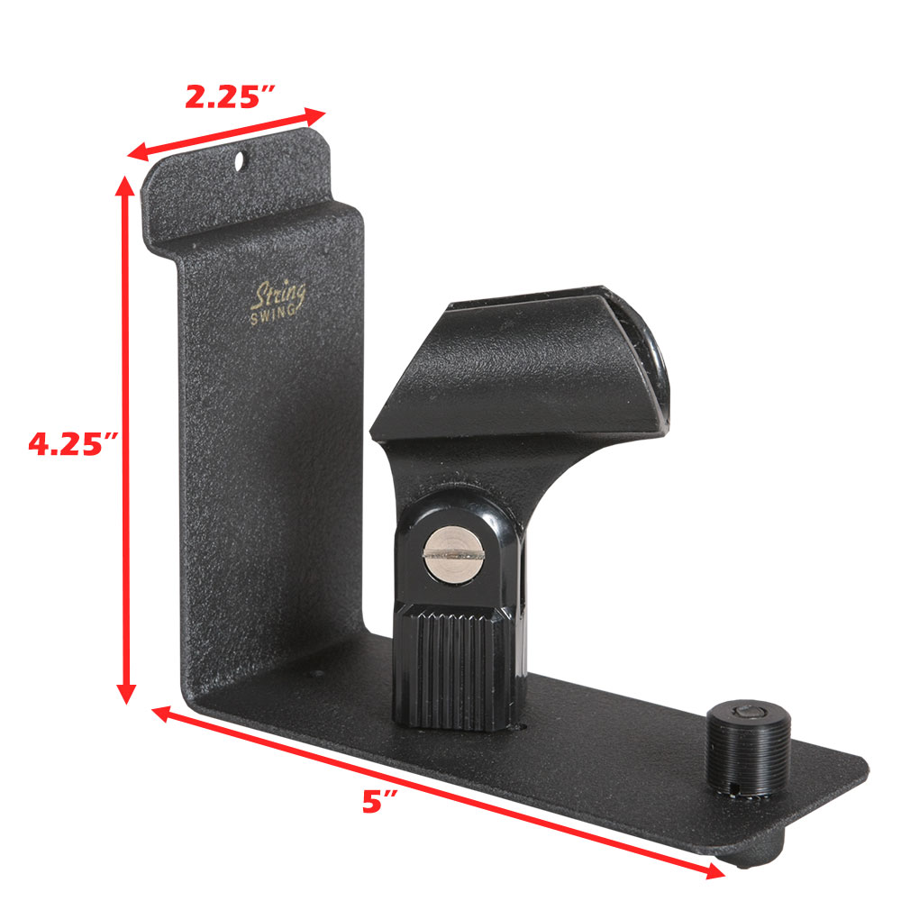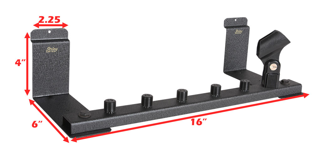 Store up to 6 microphones on our one-of-a-kind Microphone Wall Mount. This adjustable front, left, or right facing microphone holder will safely hang all of your microphones on the wall, out of the way. This powder-coated steel display features 6 threaded bushings designed to hold mic cradles (cradles not included). Installs on flat wall or 3”, 4” or 6” slatwall panels.
